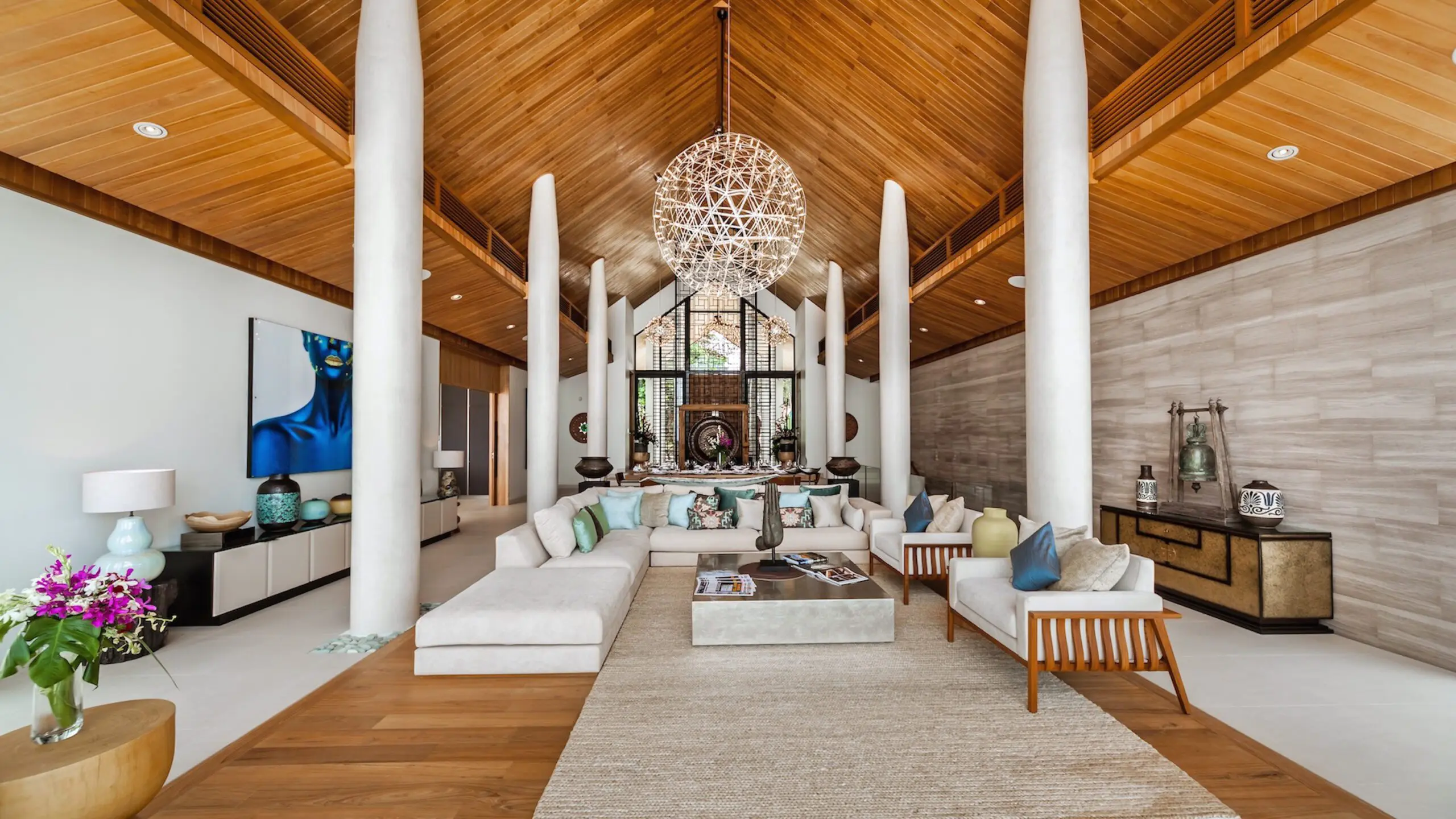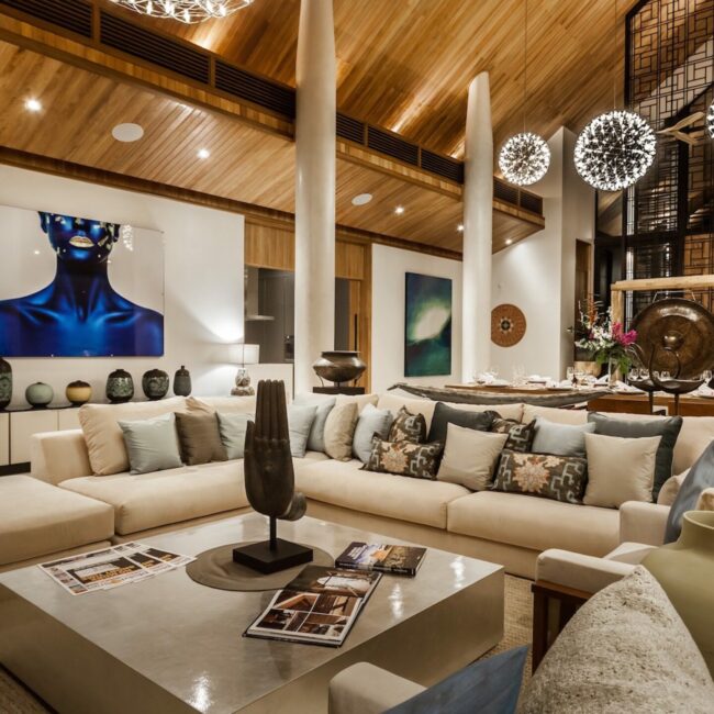 Few villas can match the artistic extravagance of Villa Amarapura. The interior boasts an impressive vaulted ceiling with wooden panels extending to the eaves. The spacious rooms and breathtaking views invoke detachment from the hustles and bustles of the city. At night, a stunning chandelier illuminates the living and dining area.